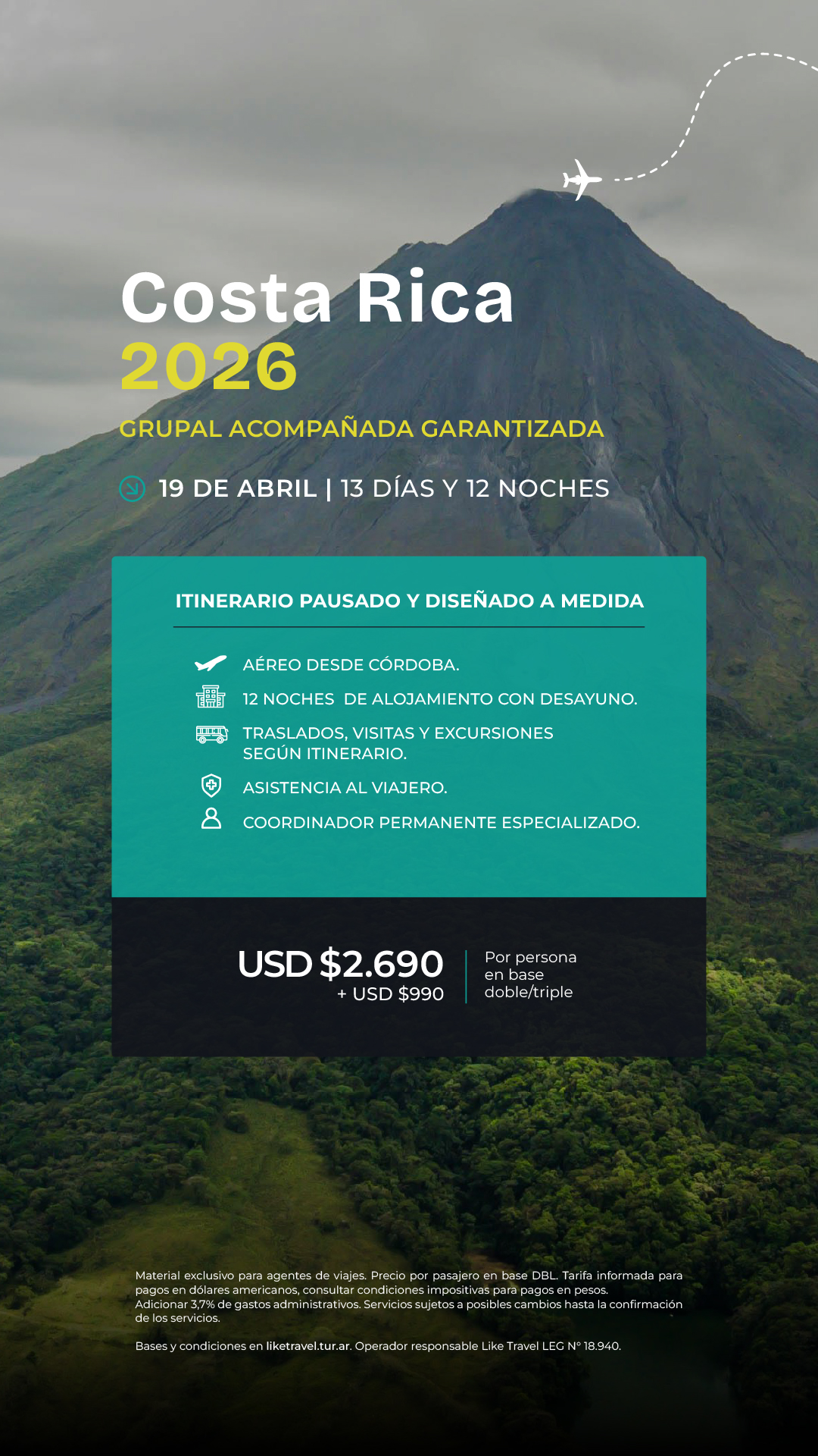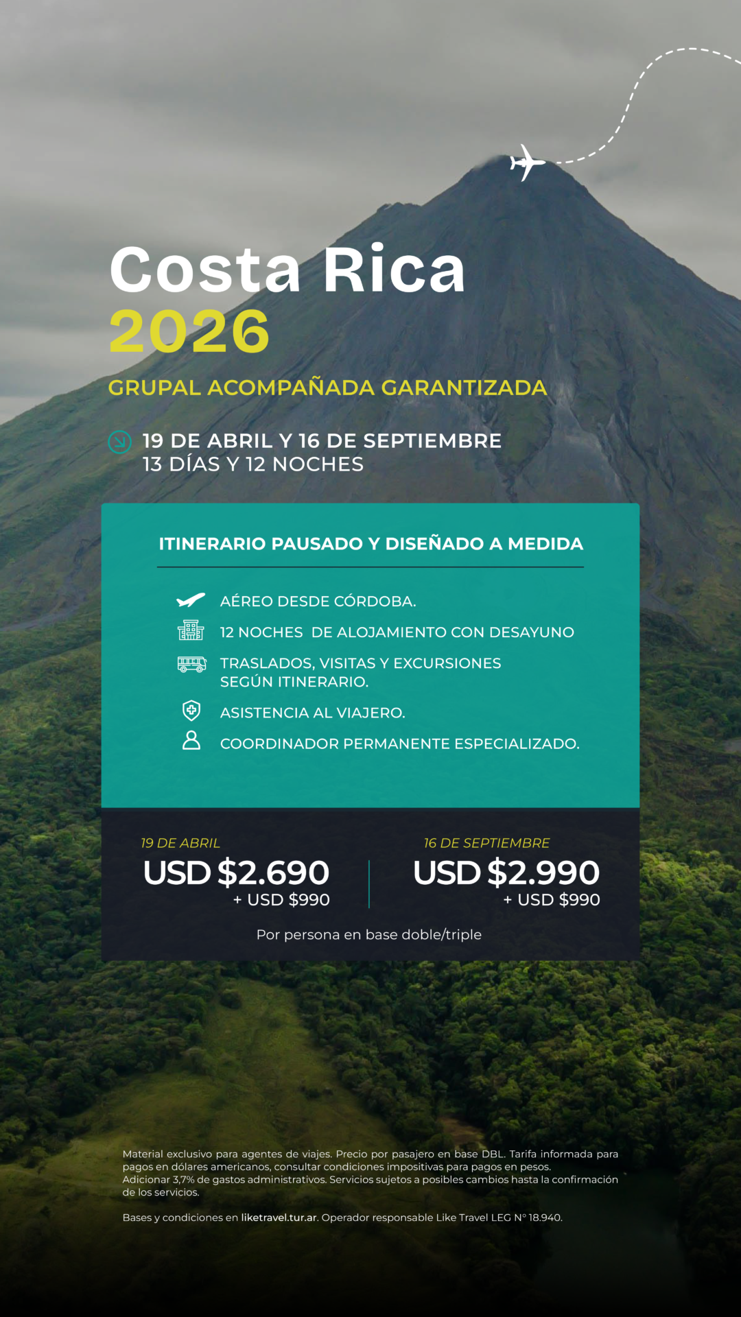 Tarifas en dólares por persona en base doble, sujetas a cambios sin previo aviso y a disponibilidad al momento de la confirmación de la reserva y emisión de los tickets aéreos. Consultar por suplemento en Single.