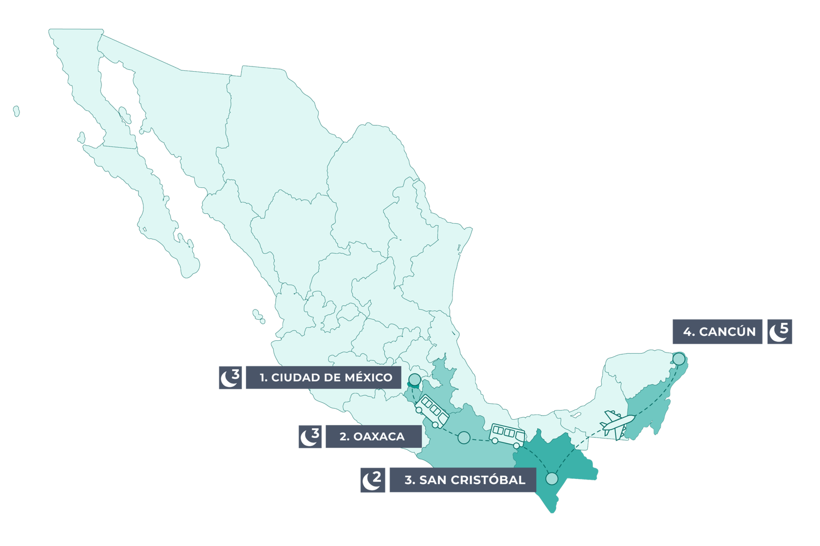 ¡Ciudad de México, Puebla, Oaxaca, San Cristóbal de las Casas y Cancún!