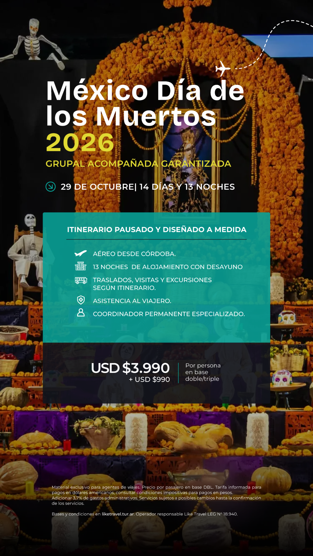 Tarifa por persona en base DOBLE/TRIPLE: USD 3.990