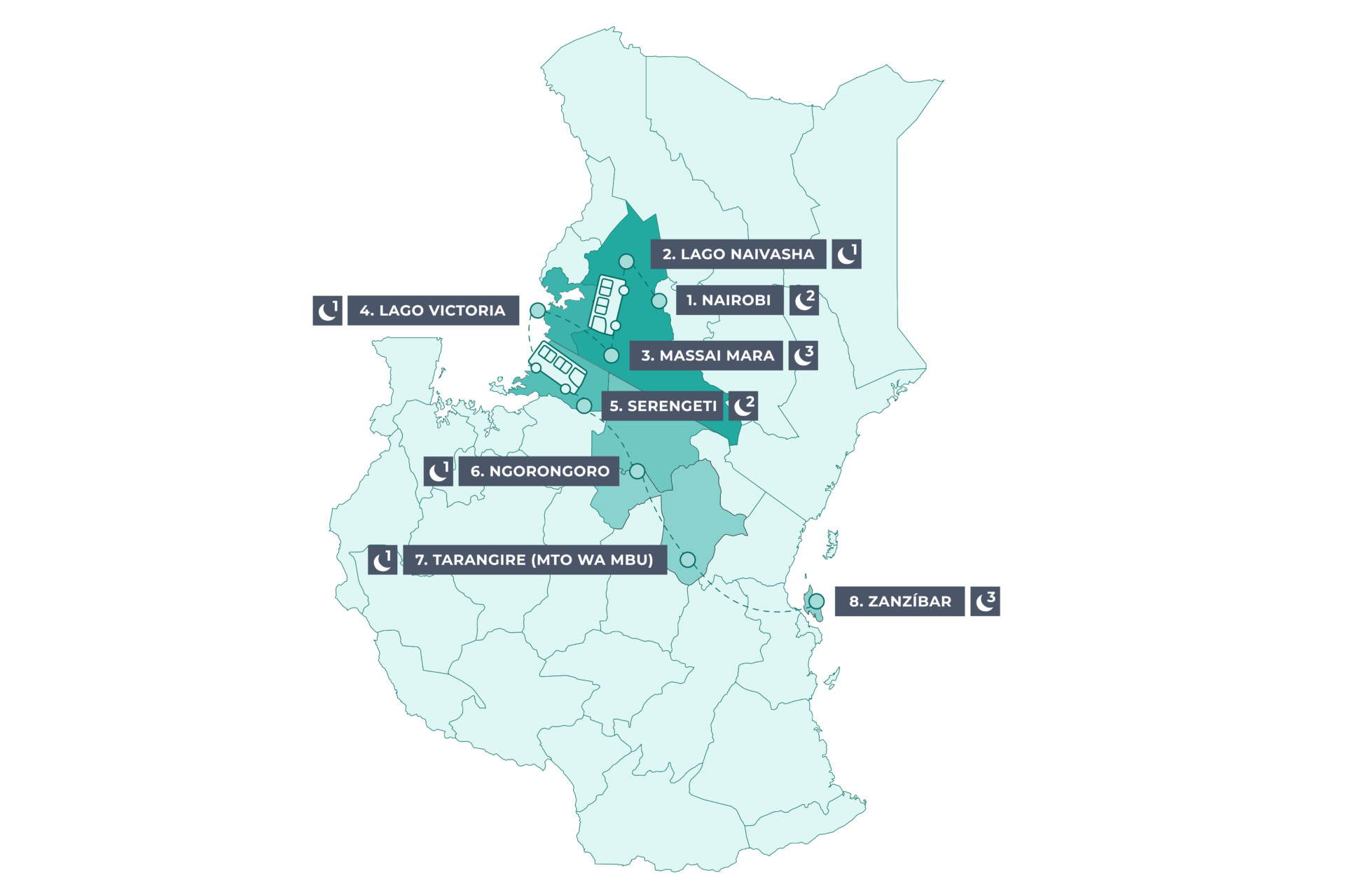 Por la mañana, realizamos un safari dentro del cráter de Ngorongoro, una caldera volcánica que alberga una increíble concentración de vida salvaje. Luego, nos dirigimos al pueblo de Mto wa Mbu, en la orilla del Lago Manyara, para conocer la vida local y disfrutar de una cena tradicional en una casa de la comunidad.