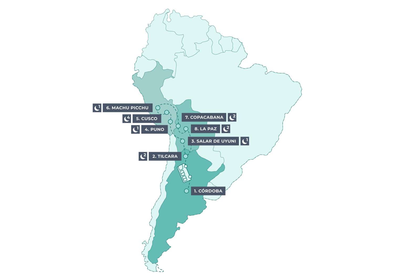 Desayuno. Mañana libre. Salida de La Paz después del mediodía. Noche en bus.