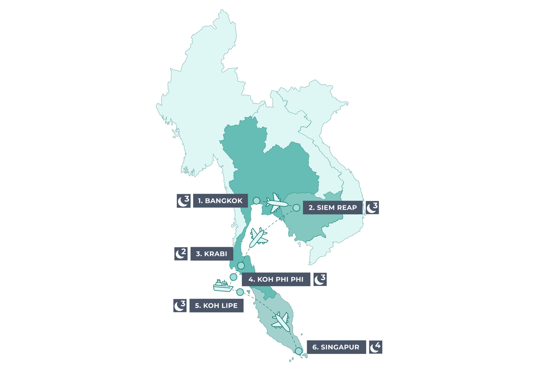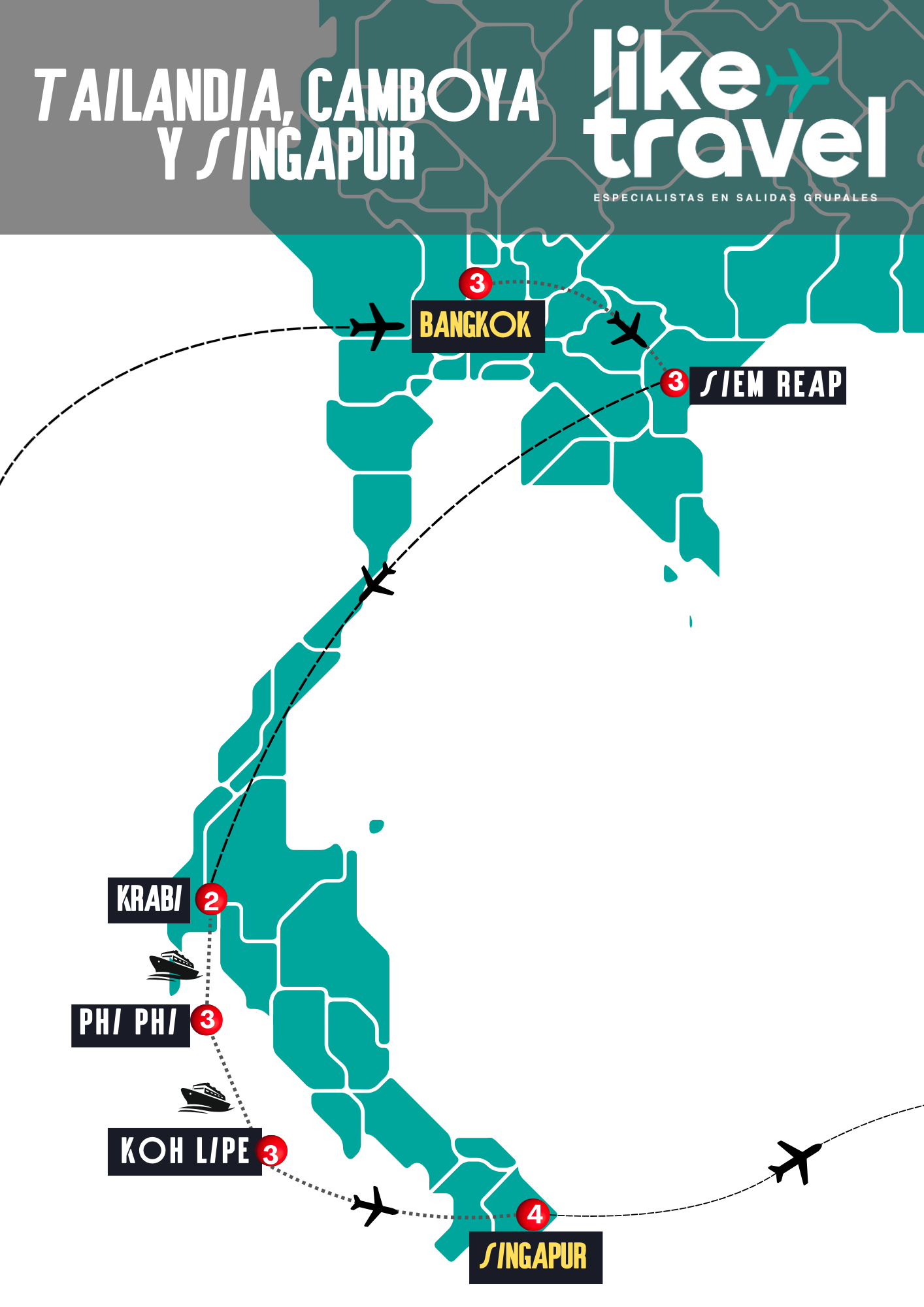 Continuaremos explorando para llegar a la exclusiva isla de Koh Lipe con sus aguas cristalinas y callecitas peatonales. Una islita remota sin vehículos y playas de ensueños. ¡Terminaremos el tour con la modernidad deslumbrante de Singapur! Mezcla de todas las culturas, en el barrio árabe, el barrio chino o el barrio hindú. Además, su modernidad en Gardens By the Bay que crean el entorno perfecto al icónico Marina Bay. Mucho más nos espera para despedir este viaje que llenará sus pupilas y sus corazones.